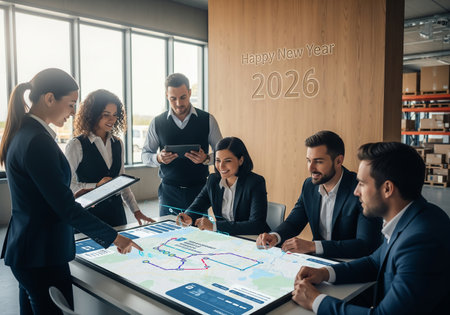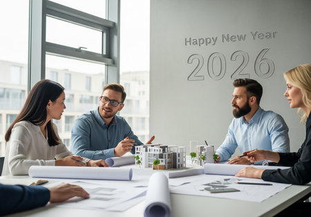 A group of professionals collaborate around a table, reviewing plans and discussing strategies for the upcoming year 2026. The atmosphere is focused and collaborative.
