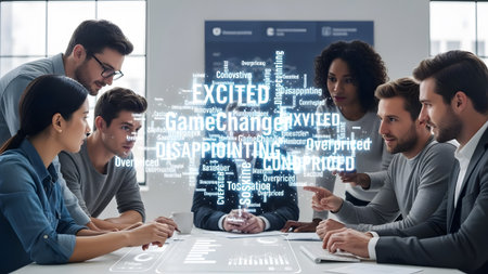 Business team discusses word cloud of customer reactions and feedback. Clear details and vibrant ...
