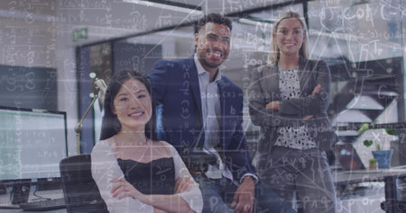 Image of mathematical equations over diverse business people working at office. Global business, finances and digital interface concept digitally generated image.