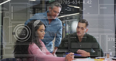 Collaborating over digital image, diverse team in modern office environment. Teamwork, collaboration, creativity, technology, innovation, diversity