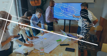 Image of blue lines over diverse business people at office. Global business, computing and digital interface concept digitally generated image.
