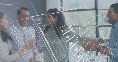 Image of financial data processing over diverse colleagues discussing work in office. Global business, finances, computing, communication and digital interface concept digitally generated image.