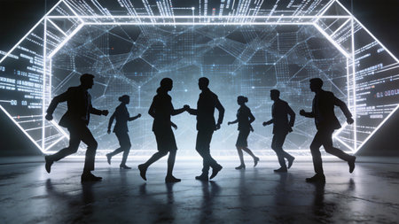 Silhouette of a group of people running in front of a futuristic background.