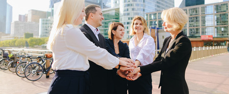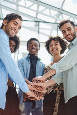 A friendly company of friends join hands as a sign of joint business