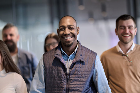 Group of confident professionals walking together through a bright modern office corridor. Concept of teamwork, diversity, success, collaboration, and positive workplace culture.