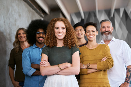 Creative agency, portrait and team with confidence, leadership and diversity in office for cooperation. Employees, collaboration and group of people with management as small business for design work