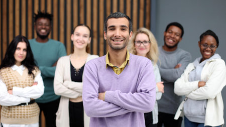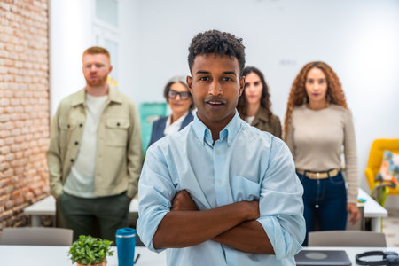 Young man standing with arms crossed, confidently looking at the camera, with his diverse team members blurred in the background, working together in a bright, contemporary office