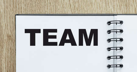Team. Word in a notebook on a white sheet at the workplace in the office.