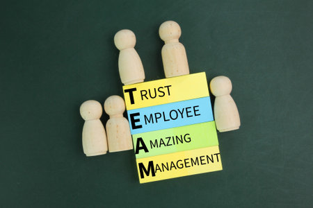 wooden figure and colored paper with the words Trust Employee Amazing Management. meaning TEAM