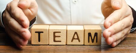 Businessman protects wooden blocks with the word Team. Care for employees. Security and safety in a business team. Human resources. A responsibility. Social protection. Life insurance.