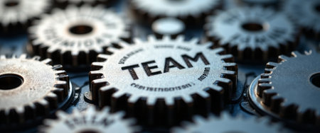 A close-up view of metallic gears, intricately arranged, with one prominent gear boldly displaying the word TEAM. This image symbolizes collaboration and unity, emphasizing how each individual part plays a crucial role in the larger mechanism of success.