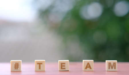 Word team on wooden block, relationship of collaboration and leadership for success, group of community and employee with corporate, teamwork for brainstorming together, no people, business concepts.