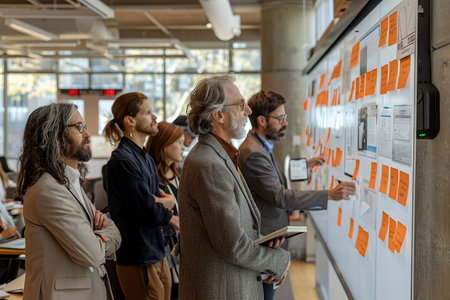 Team members intently review papers and sticky notes, indicating dedicated effort in strategic planning, problem-solving, and collective decision-making within a professional setting.