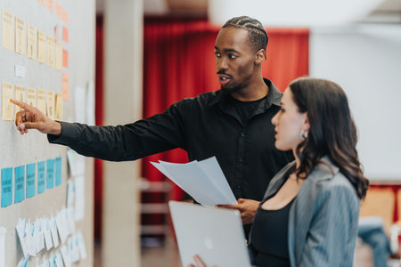 Brainstorming Group of young business people using blackboard with adhesive notes while working in the office : Generative AI