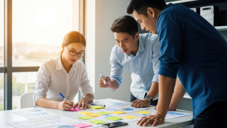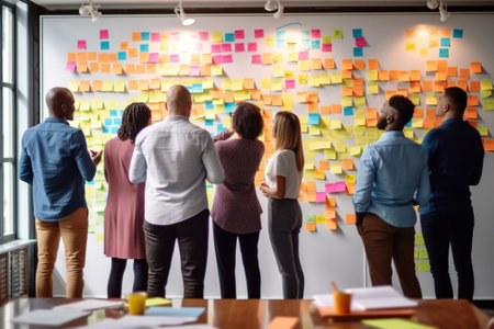 Team collaborates on project planning using colorful notes in a modern office space during a brainstorming session