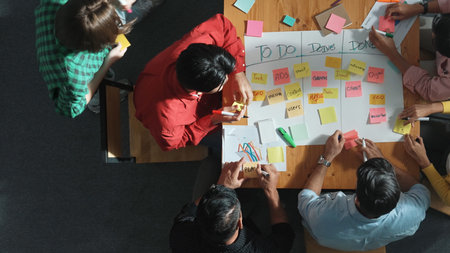 Top view of smart people writing and making scrum task board while writing plan and planning strategy at colorful sticky notes. Smart team manage work performance by using kanban board. Convocation.