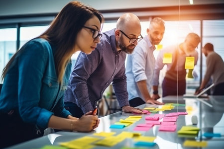 Group of employees brainstorming with sticky notes on a glass wall Generative AI
