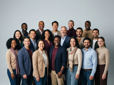 A diverse group of people of different ethnicities and genders are standing together and smiling at the camera.