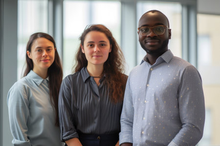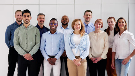 A diverse group of professionals stands confidently in an office environment, dressed in business attire. High quality photo