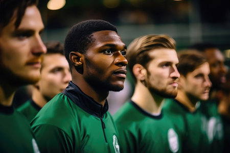 A male football coach, with a close-up profile, inspires focus among his red-uniformed team members.