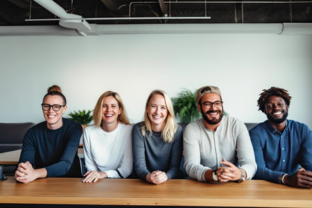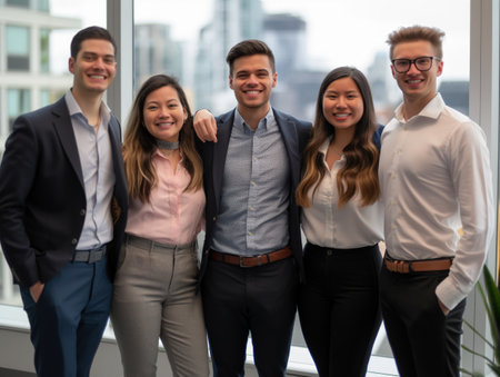 A vibrant group of young professionals radiates success in a hallway. The portrait captures teamwork, collaboration, and a sense of unified purpose.