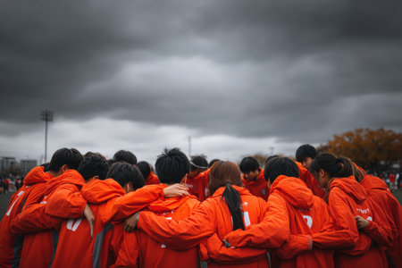 Players in bright orange jackets huddle together, showing camaraderie and focus. The atmosphere is tense as they prepare for competition amidst dark clouds overhead.