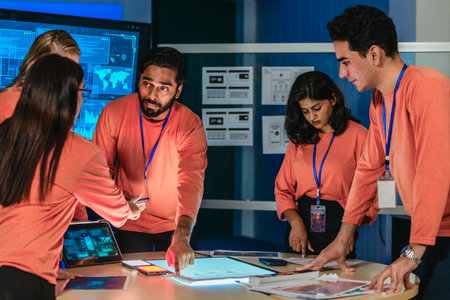 A diverse engineering team poses confidently together, showcasing professionalism and unity in a modern workspace. Each individual brings unique skills and energy.