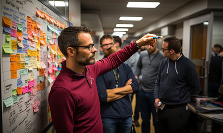 A group of people are looking at a whiteboard with colorful sticky notes on it. Scene is collaborative and focused, as the group is working together to brainstorm ideas