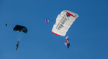 RUSTENBURG, SOUTH AFRICA - April 28, 2017: National Skydiving Championships. Two skydivers with colourful chutes circling in queue for landing.