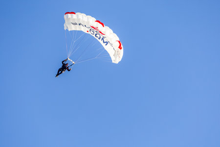 RUSTENBURG, SOUTH AFRICA - April 28, 2017: National Skydiving Championships. Jumper with white open parachute – text area available.