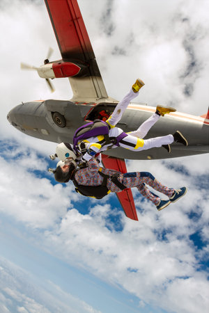 Two girls parachutist jumping out of an airplane