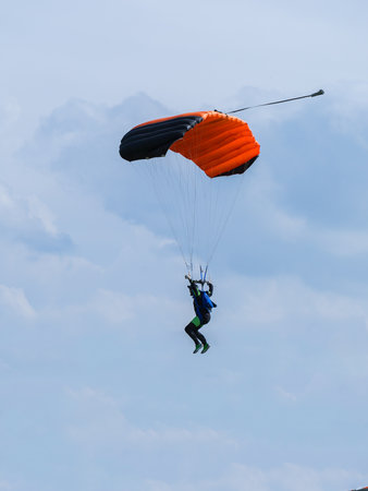 Parachutist with Orange Parachute against Blue Sky preparing for Landing