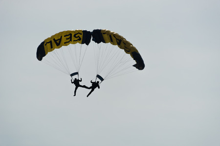 USA, Portsmouth - August 14, 2011: US army parachute jumper demonstrates a gliding technique during air show.