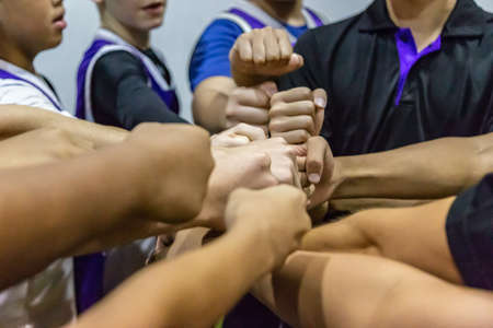 Male basketball players and their coach putting their fists together to pump themselves up before the strart of their game