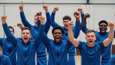 Great satisfaction after good game. Players relaxing on court having a conversation after game. Diversity and multi ethnic people in sports team. Coach gives instructions to football team. Team scream