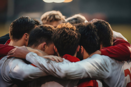 Soccer players huddled together, strategizing before a match, demonstrating teamwork and sportsmanship