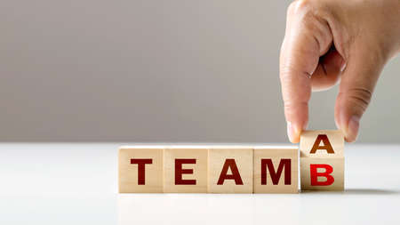 Changing wooden cubes from TEAM A to TEAM B with the hands of investors, collaborative ideas or building teams to work on.