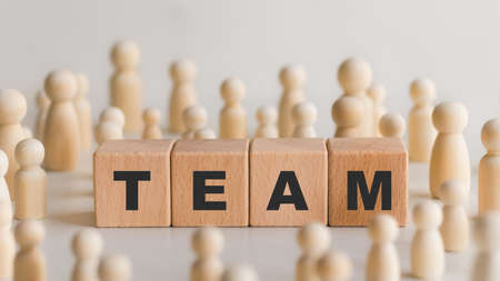 Teamwork concept, wooden dolls and wooden blocks with team words, working together for future goals.
