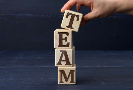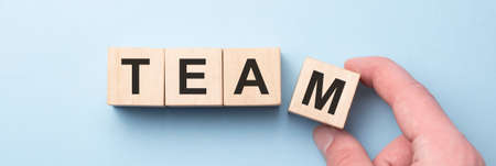 Hand hold wooden cube elements with letter on wooden table, which represents team. Business concept.