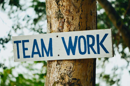 A handmade teamwork sign in blue paint on a white sign. The sign is nailed to a tree.