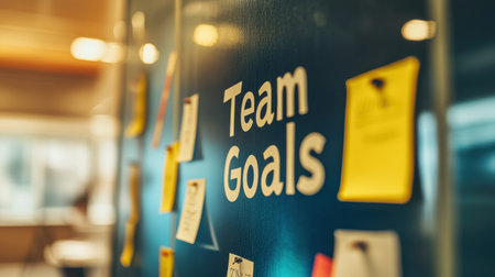 Office glass wall with Team Goals printed in vinyl and sticky notes around it