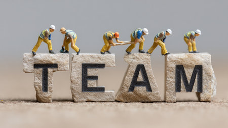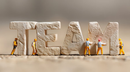 A creative depiction of miniature figures working together to construct the word TEAM from concrete elements, symbolizing collaboration and unity in various projects.