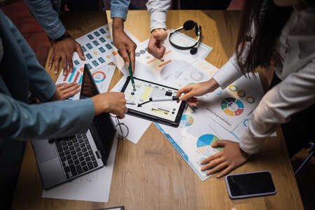 Four multi ethnic brokers analysing financial statistic on market using modern gadget at office. Male and female colleagues sharing with ideas and knowledge during briefing.