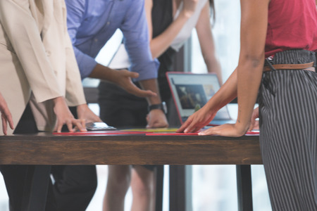 Top view on a group of businessman and businesswoman having a meeting and making a business commitment.
