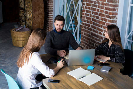 Teamwork of successful business content writers, talking about work, using laptop computer. Students learning online in university library. CEO having interview with new employees sitting in office