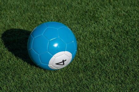Blue number 4 soccer billiards on green grass