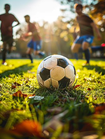 Soccer ball on a grassy field with players silhouettes and autumn leaves, lit by a soft sunset