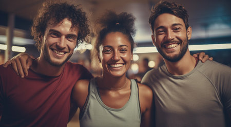 three friends smiling for a photo at a gym.