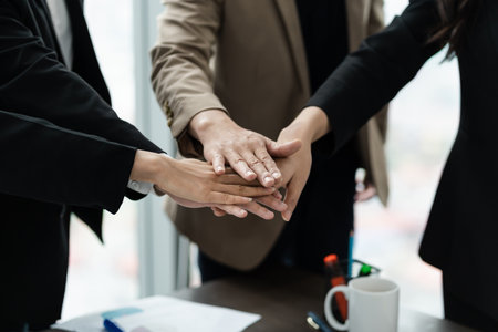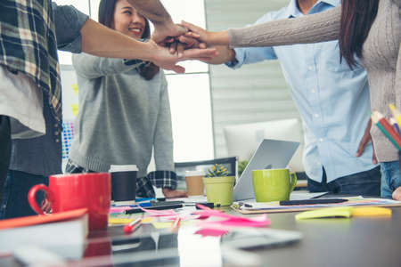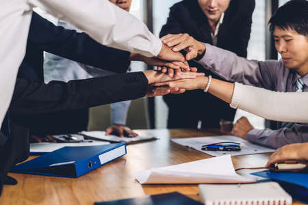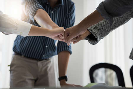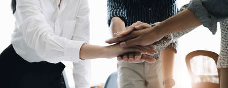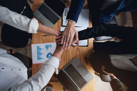 Successful of group business people stack and putting their hands together at office.Teamwork concept