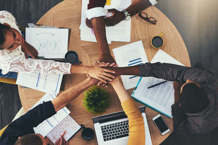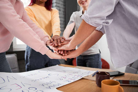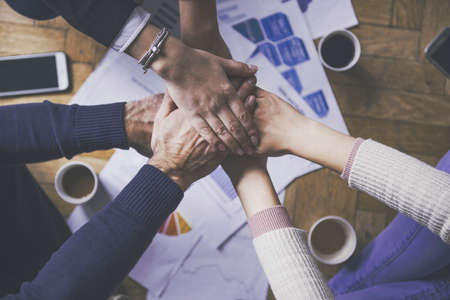 Close up top view of young business people putting their hands together at the office. Stack of hands. Teamwork concept.